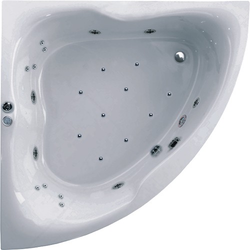 Eclipse corner whirlpool bath with 24 jets, pre-fitted pump, legs, pop up waste and underwater LED light. Size 1400 x 1400mm.
