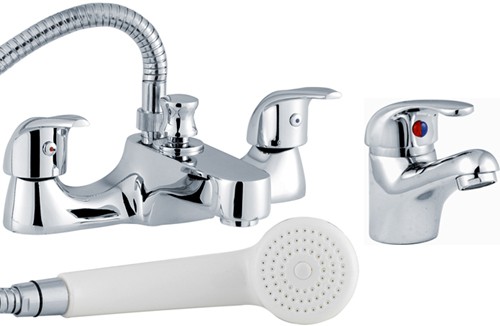 Basin mixer and bath shower mixer faucet set in chrome with free shower kit.
