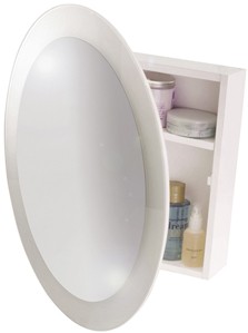 Round mirror bathroom cabinet in white with hinged door. Size 525W x 525H x 105D mm.