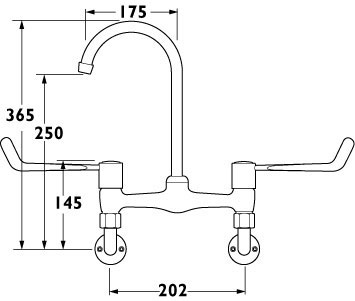 Wall mounted bridge sink faucet with 6" long handles.