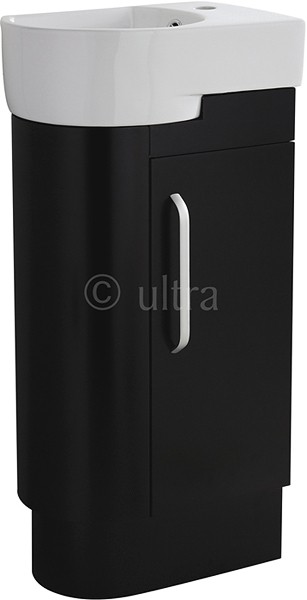 Floor standing cloakroom vanity unit in black with built in cupboard and 1 faucet hole ceramic basin. Left handed. Size 410W x 850H x 270D mm.